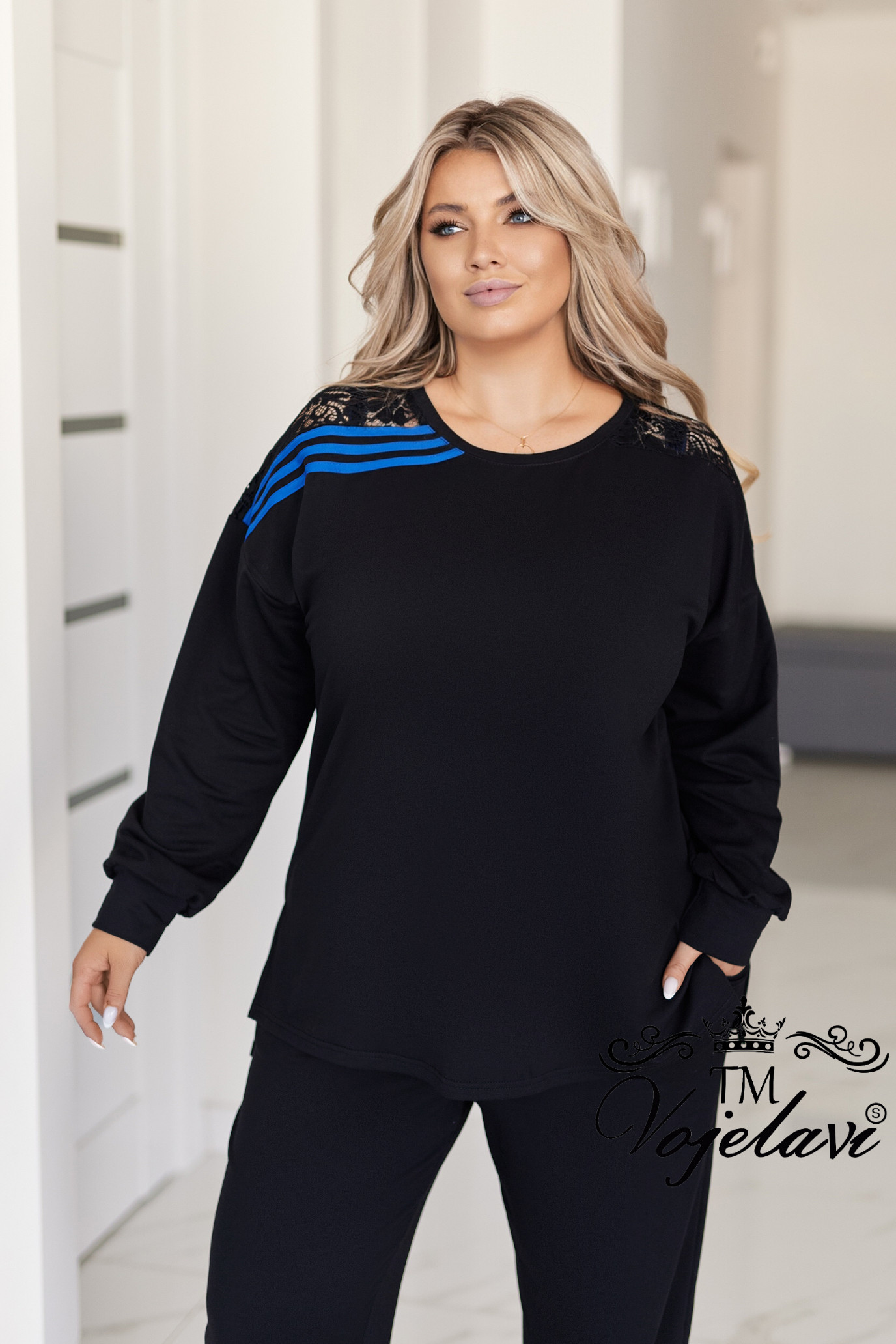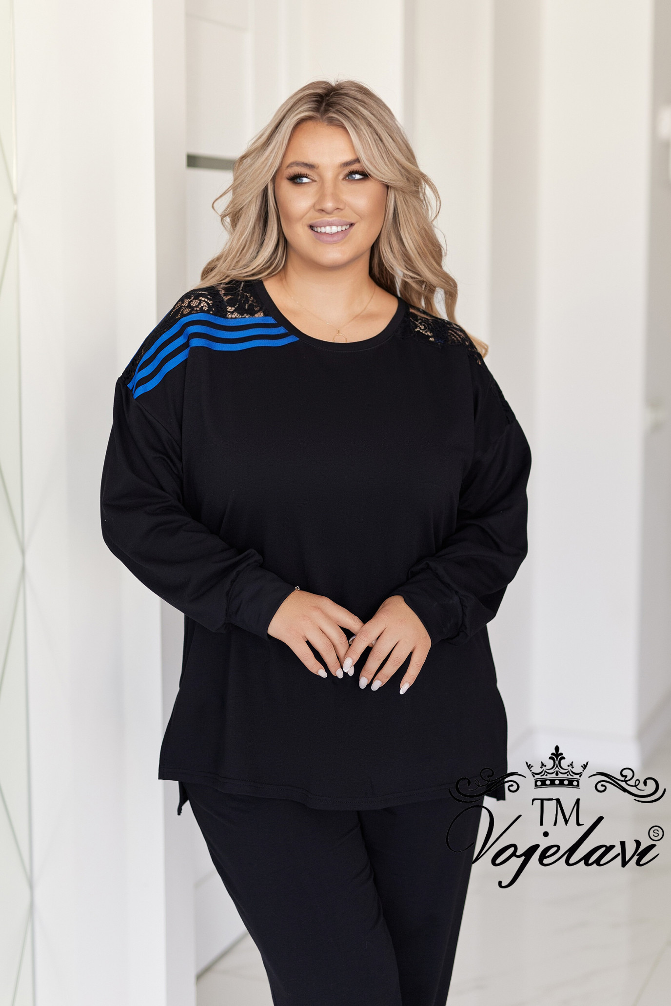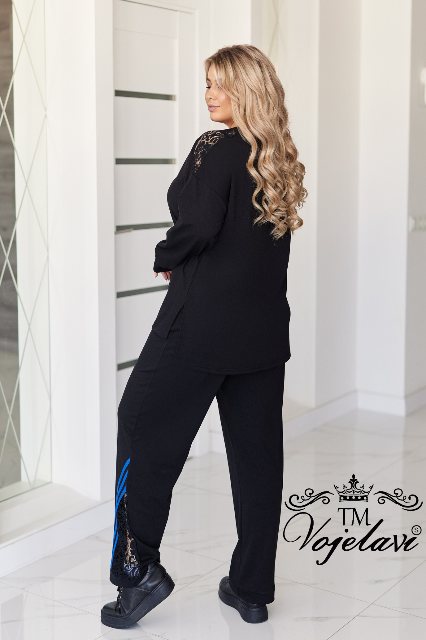 ●Штани прямого крою з високою посадкою, по боках лампаси та вставки з гіпюру, що створюють стильний акцент.