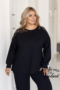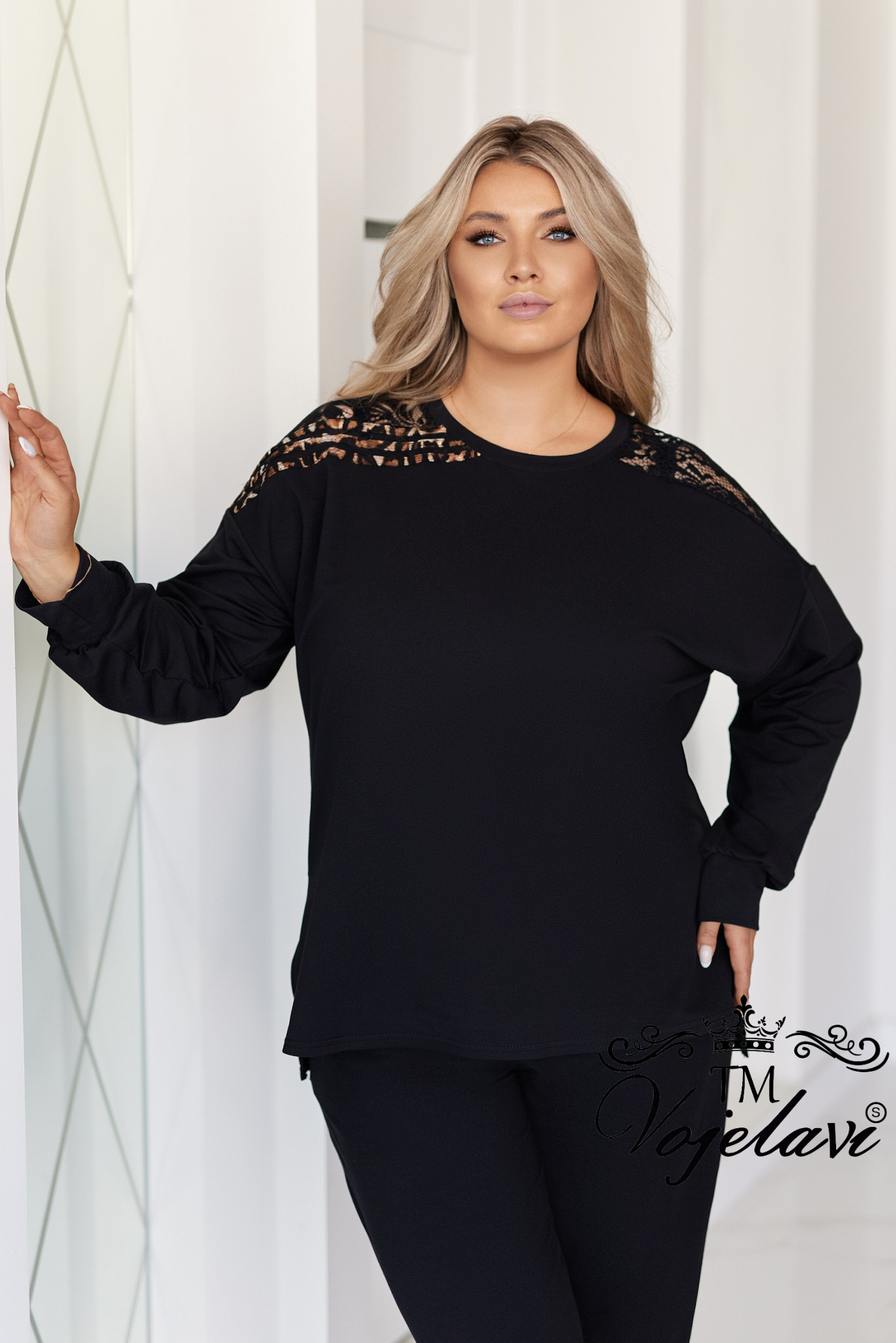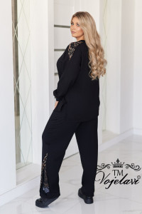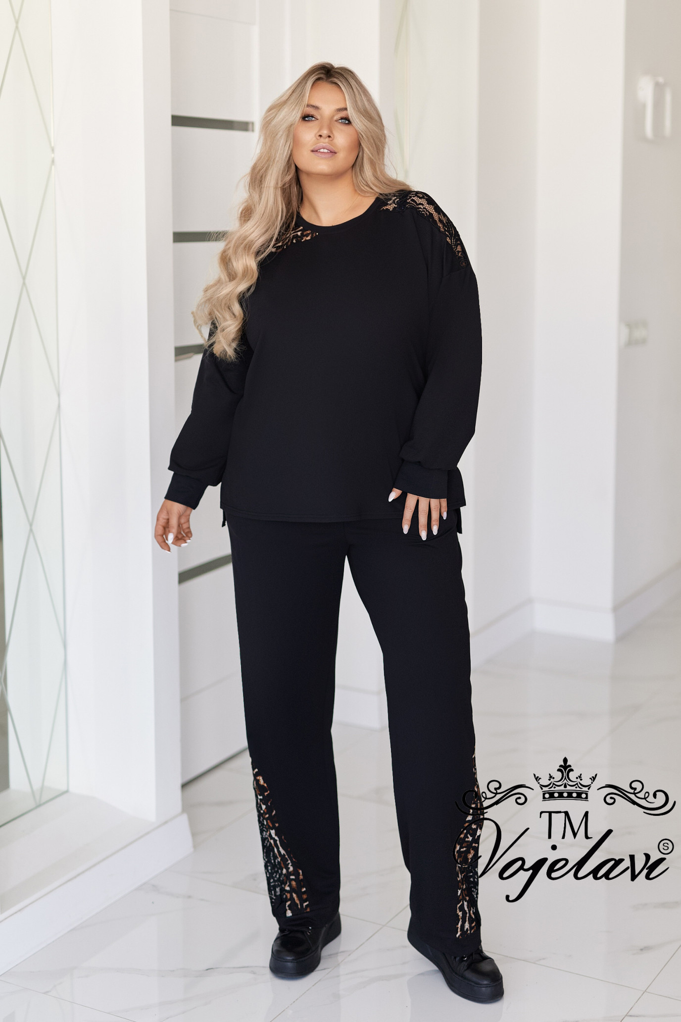 ●Штани прямого крою з високою посадкою, по боках лампаси та вставки з гіпюру, що створюють стильний акцент.