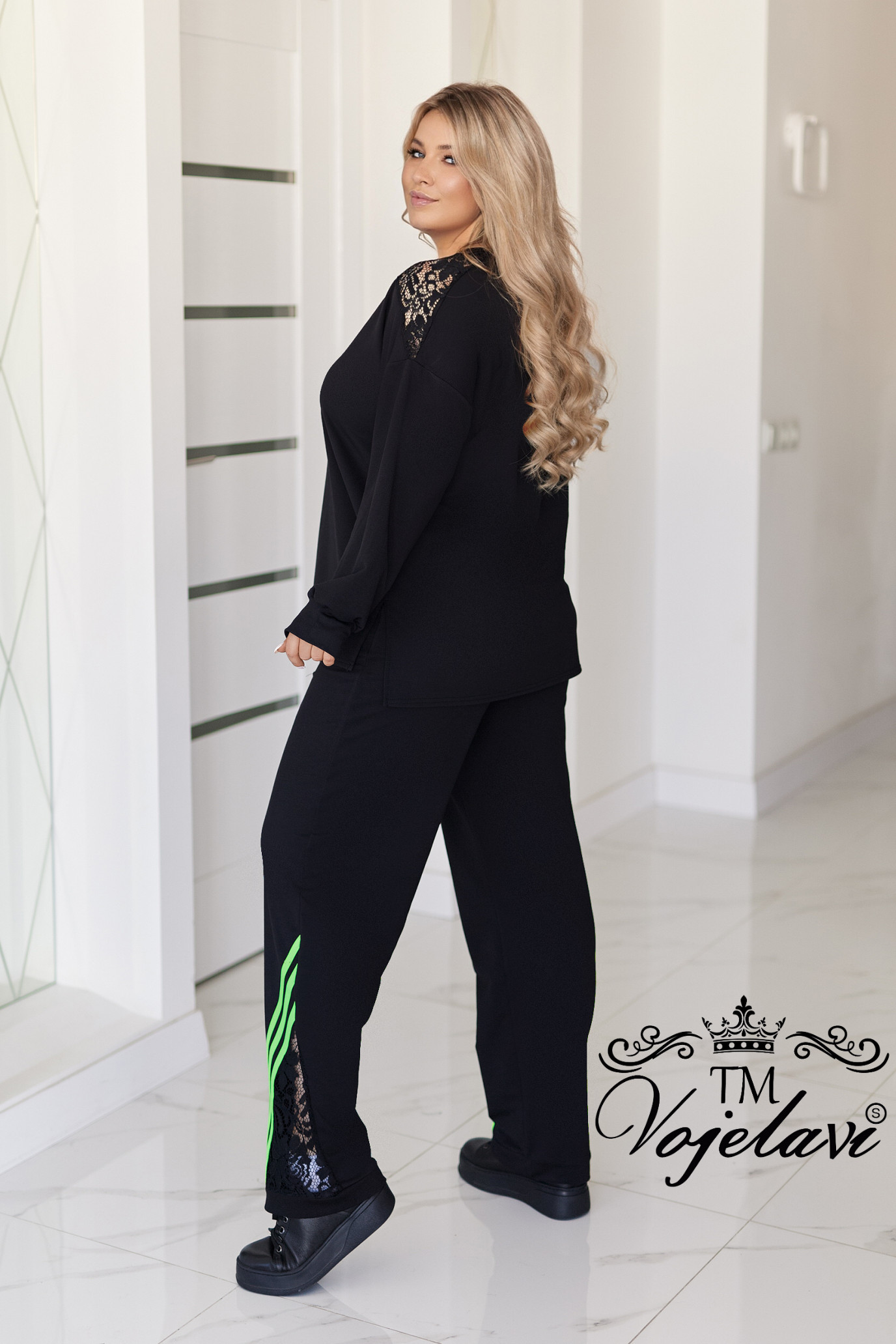 ●Штани прямого крою з високою посадкою, по боках лампаси та вставки з гіпюру, що створюють стильний акцент.