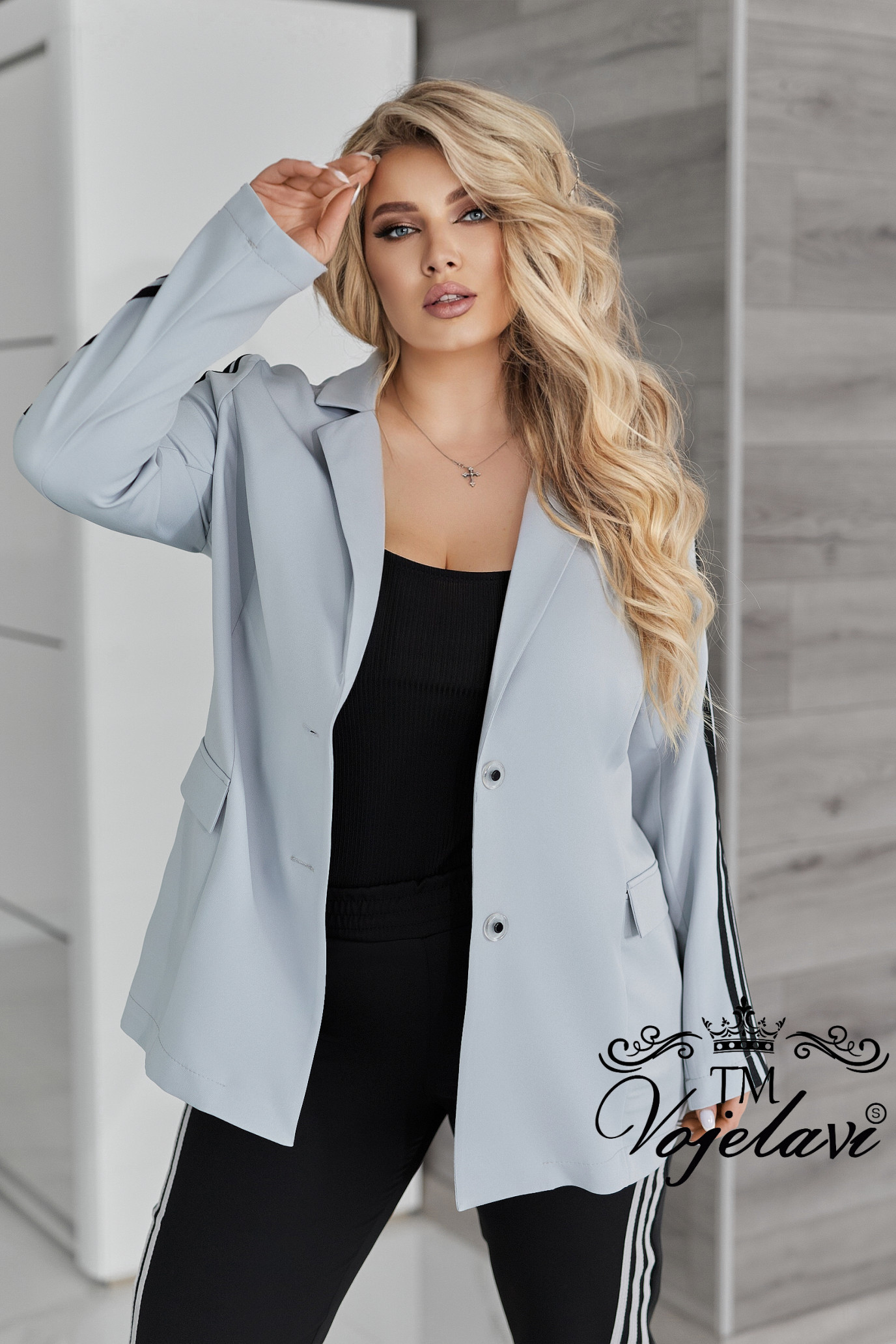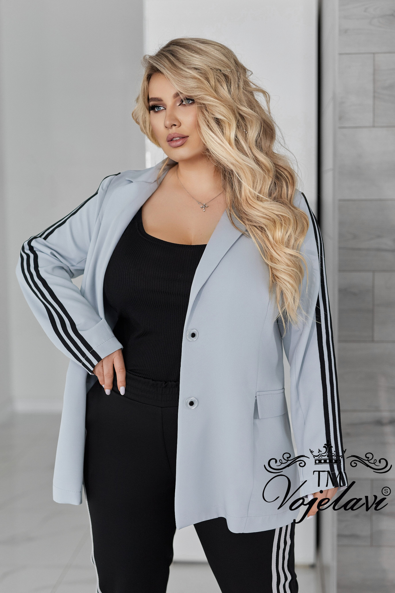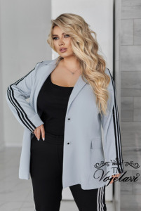 Рукава декоровані лампасами, що візуально витягують силует і додають динаміки образу.