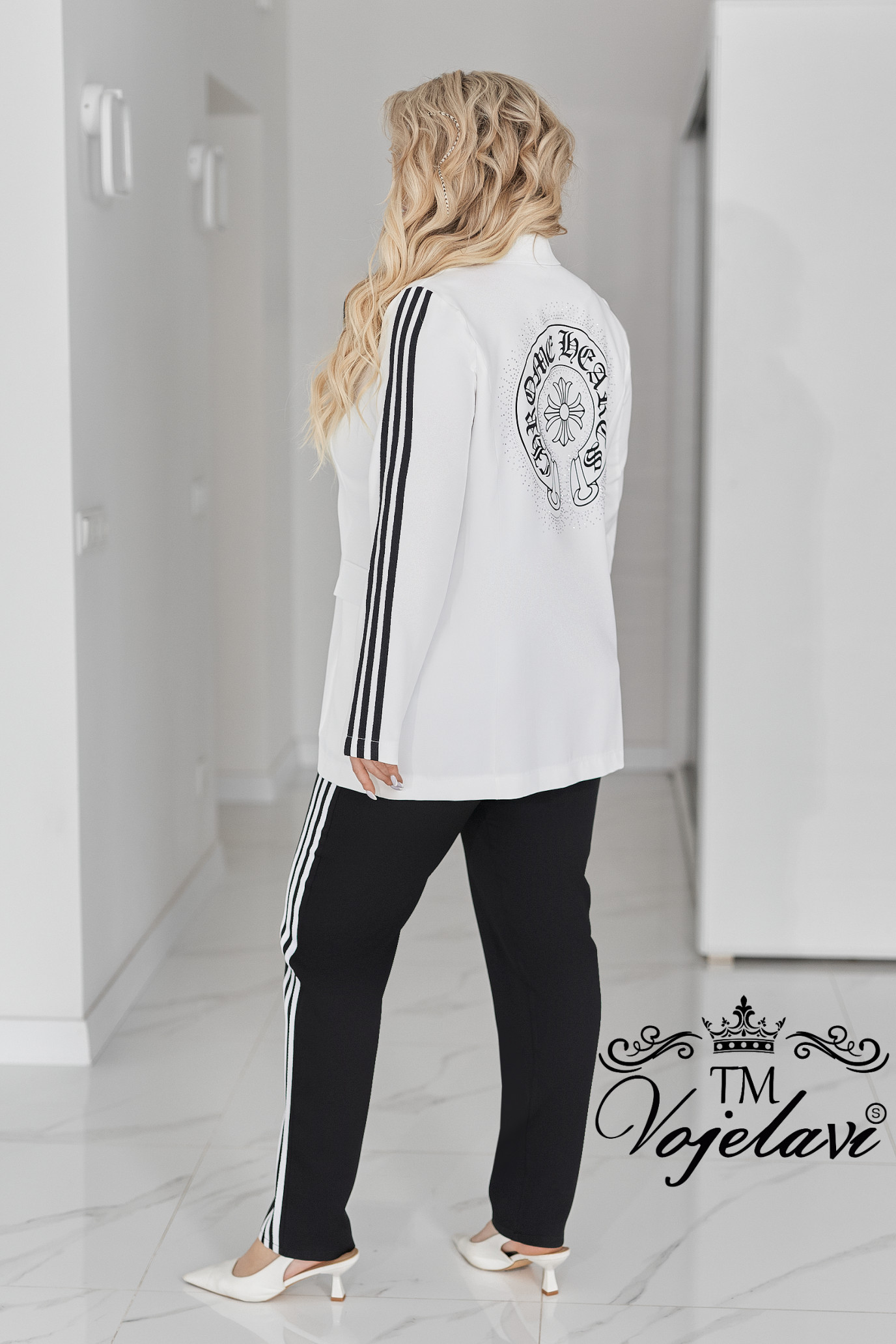 Рукава декоровані лампасами, що візуально витягують силует і додають динаміки образу.