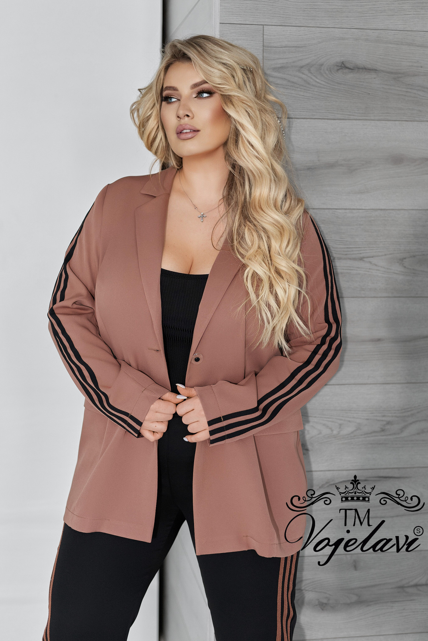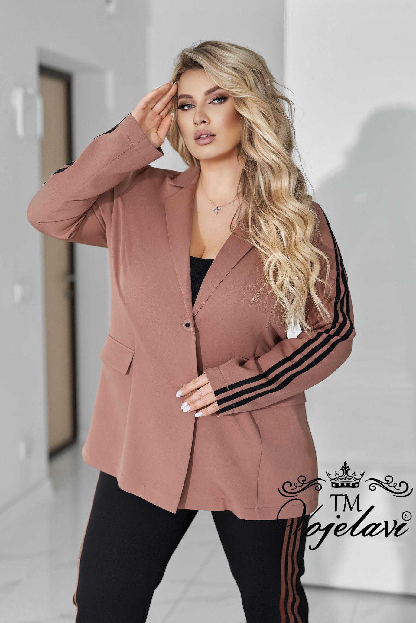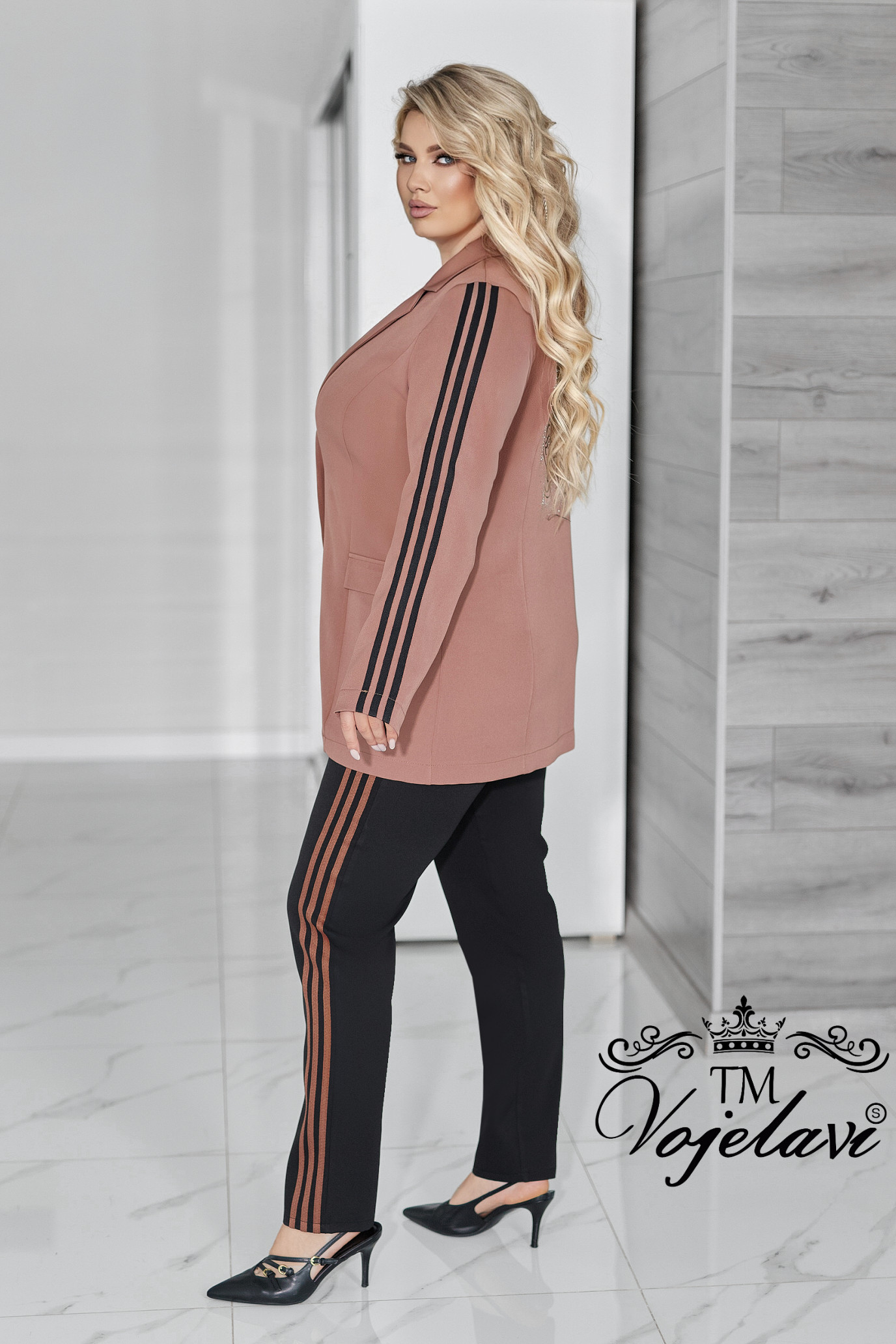 Рукава декоровані лампасами, що візуально витягують силует і додають динаміки образу.