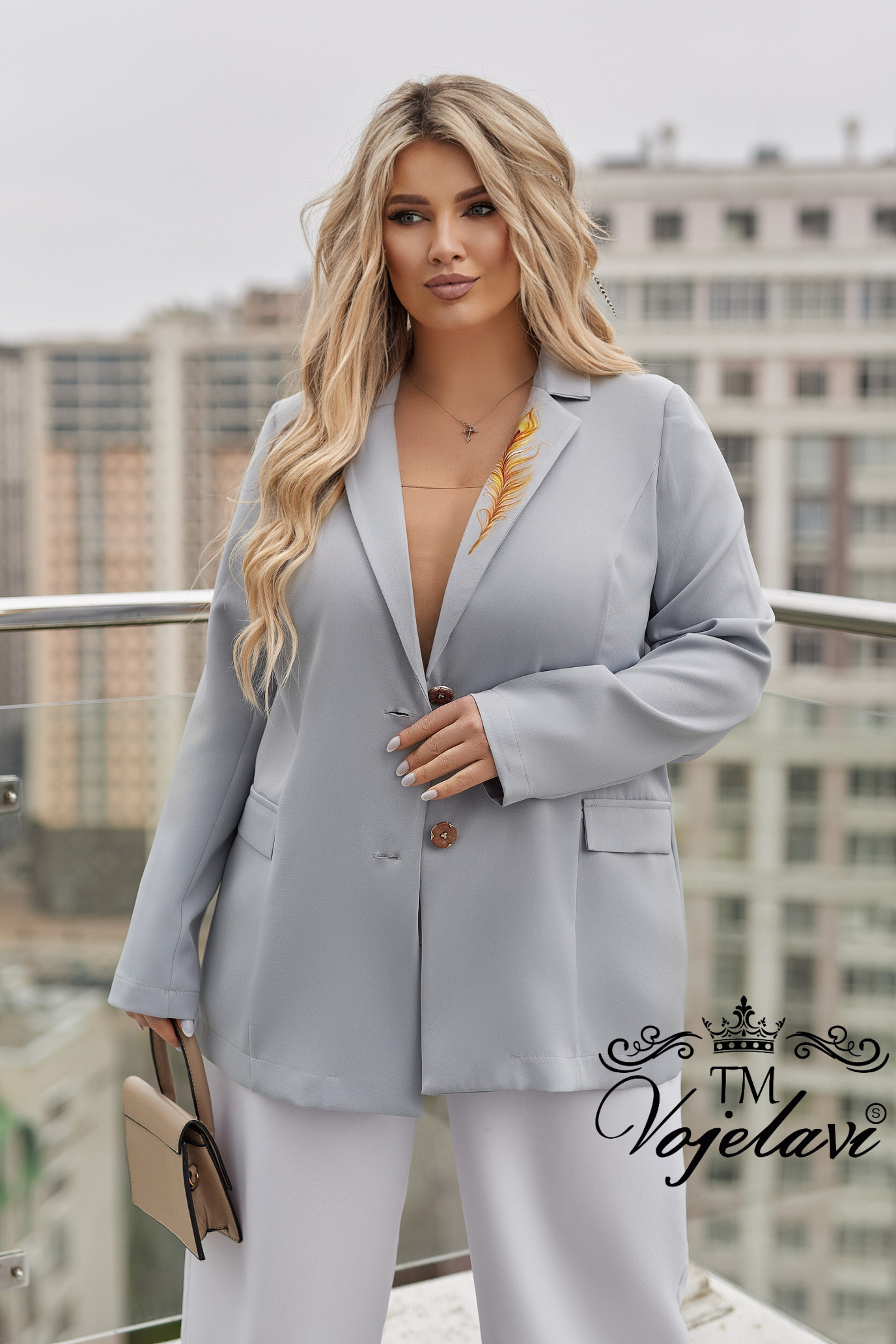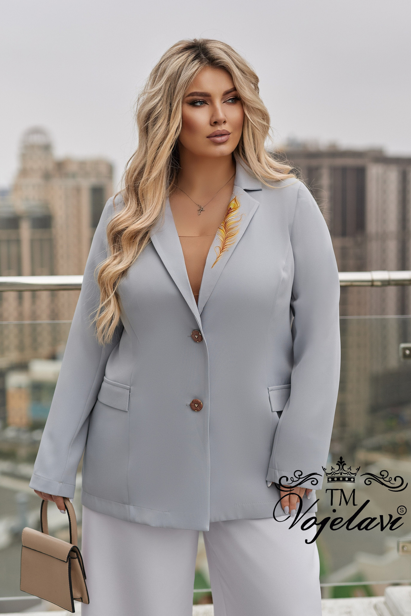 На лацкані — витончене перо, що гармонійно доповнює дизайн.