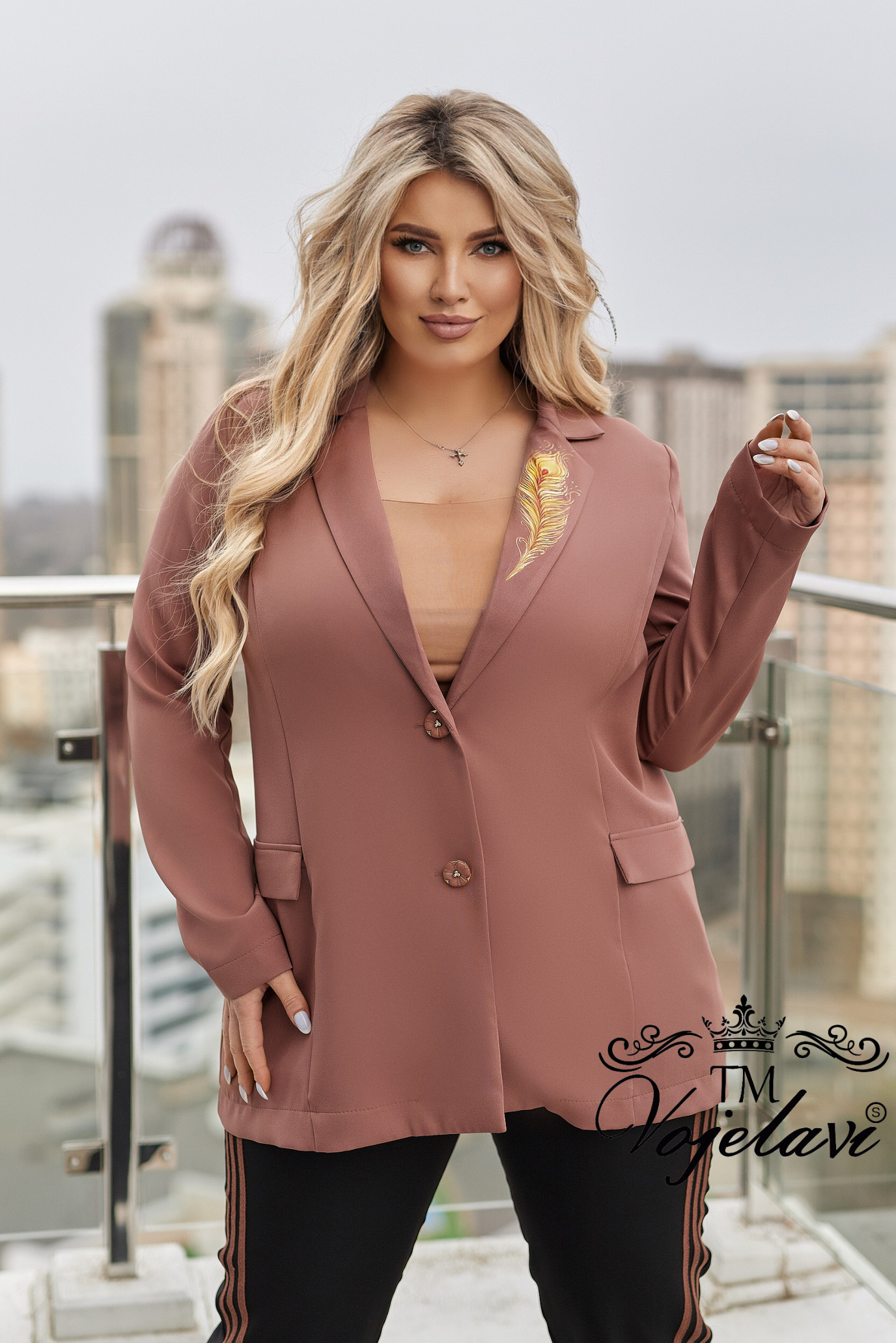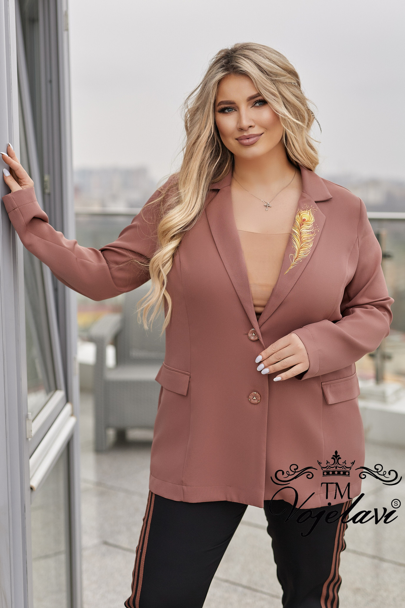 На лацкані — витончене перо, що гармонійно доповнює дизайн.