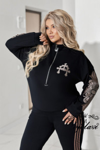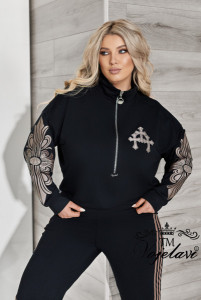 Кофтинка вільного покрою зі стійкою комірцем — зручна та сучасна. Модель декорована аплікацією з тканини, оздобленою стразами DMS, що додає образу яскравого та стильного акценту. Рукава прикрашені апплікацією, яка підкреслюють спортивний модний та сучасний стиль.