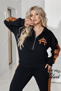 Кофтинка вільного покрою зі стійкою комірцем — зручна та сучасна. Модель декорована аплікацією з тканини, оздобленою стразами DMS, що додає образу яскравого та стильного акценту. Рукава прикрашені апплікацією, яка підкреслюють спортивний модний та сучасний стиль.