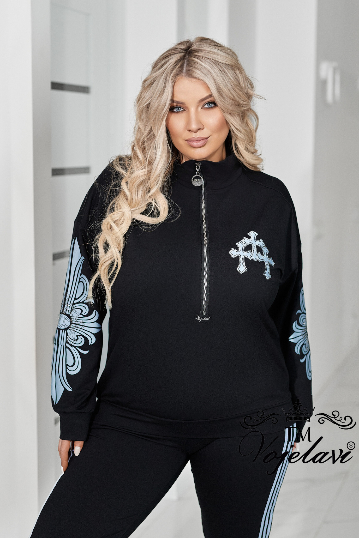 Кофтинка вільного покрою зі стійкою комірцем — зручна та сучасна. Модель декорована аплікацією з тканини, оздобленою стразами DMS, що додає образу яскравого та стильного акценту. Рукава прикрашені апплікацією, яка підкреслюють спортивний модний та сучасний стиль.